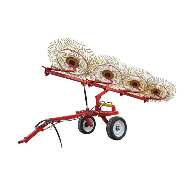 Коли трактор тягнеРотаційна колеса трава граблівперед, колеса обертаються з ним. Під час цього процесу колесо обережно підніме врожай, а потім повільно збирає його в середину. Те, як крутяться колеса, це як перевернути сіно чи корм і випускати його в ефір, так що воно висохне швидше. Оператор також може регулювати кут колеса, як потрібно, щоб контролювати, наскільки широка і щільна купа врожаю. Таким чином, це буде зручніше для подальшого балування або збирання врожаю.