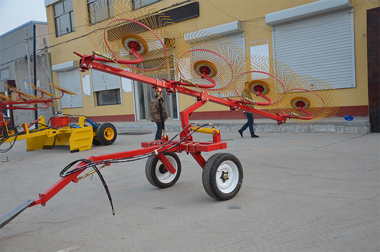 Граблі колісного сіна підходять не лише для збору та сортування сіна та соломи, але й для очищення загиблих листя та бур’янів у садах, газонах та інших місцях, що значно покращує його застосування. Будь то велика ферма чи невелика сімейна ферма, її можна знайти на сцені.